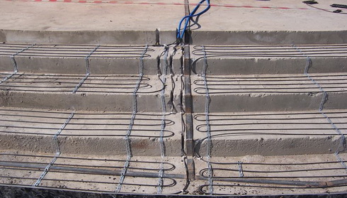 - После того, как площадь полностью залита бетоном, запускается система обогрева. При этом скорость повышения температуры должна составлять не более десяти градусов по Цельсию за два часа.