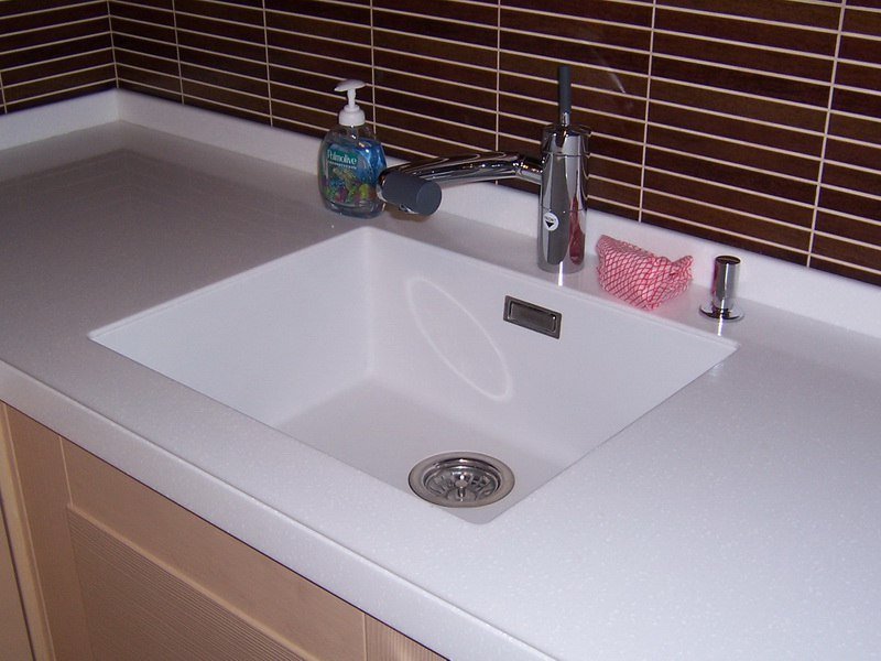 К преимуществам монолитных столешниц из акрила с мойкой относятся: