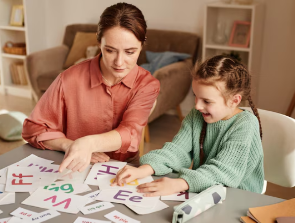 [️ ИЗОБРАЖЕНИЕ: Мама и ребенок 6-7 лет сидят на ярком ковре в детской комнате. Они смеются и играют с красочными карточками, на которых нарисованы животные и написаны их названия на английском (например, «Cat», «Dog»). Вокруг разложены кубики с буквами английского алфавита. Атмосфера радостная и непринужденная. Подпись: Игровой подход — ключ к успешному изучению английского в первом классе. Стиль: Яркая, светлая фотография в стиле лайфстайл.]